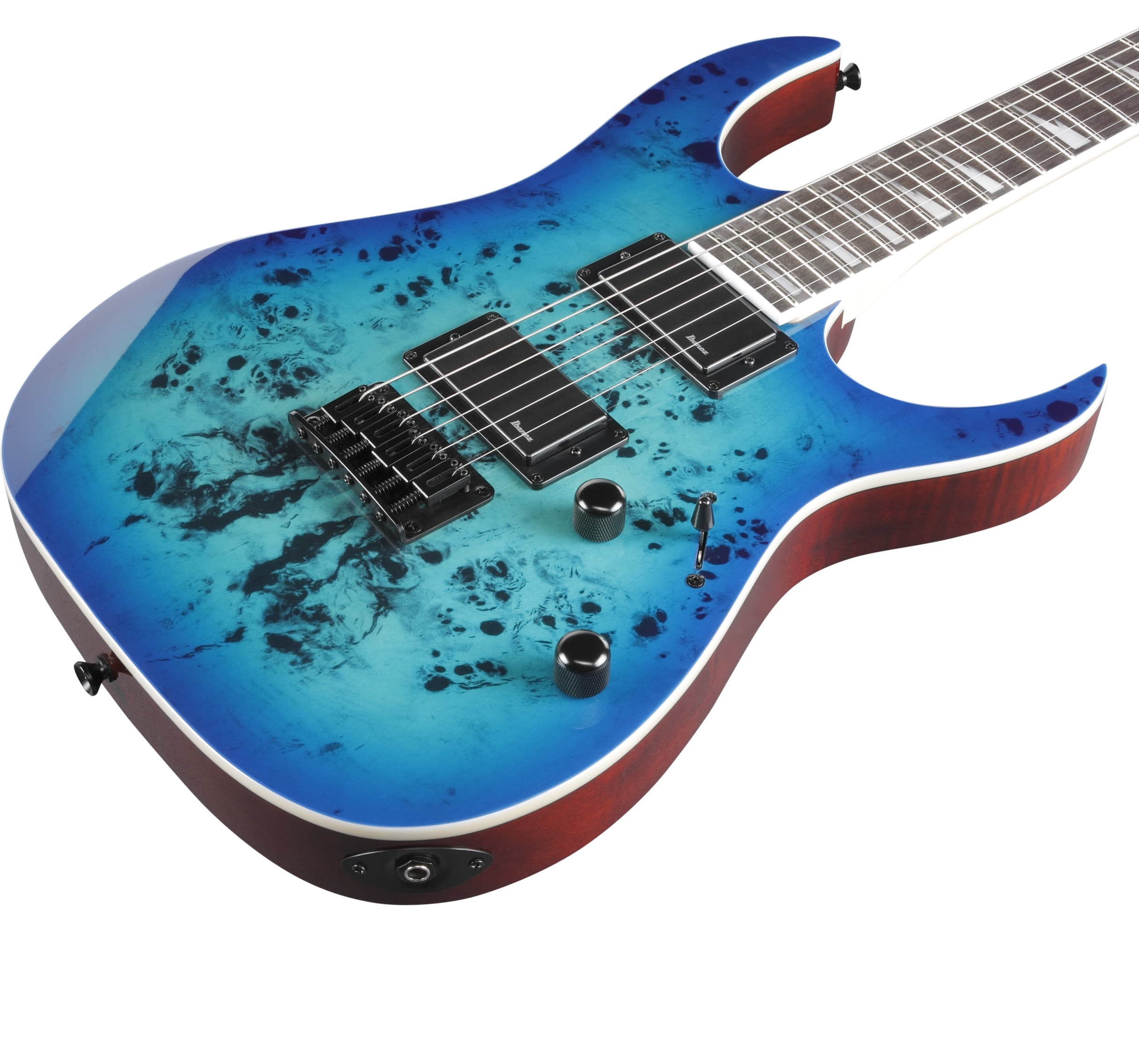 Корпус GRGR221PA-AQB сделан из Окоуме с эффектным топом из капа тополя. Гриф гитары профиля GRGR кленовый. Накладка на гриф Purple heart (фиолетовое дерево). На грифе 24 лада размера Jumbo с инкрустацией в виде перевернутых белых акульих зубов. Звукосниматели два пассивных хамбакера IBZ-6 с керамическими магнитами. Переключатель 5-позиционный. Звук настраивается одним регулятором громкости и одним регулятором тона. Бридж фиксированный Ibanez F106. Модель представлена в роскошном цвете Aqua Burst, с головой грифа в цвет корпуса, черной фурнитурой. Кленовый гриф.Кленовый гриф обеспечивает стабильность и яркое звучание. Накладка из амаранта. Накладка из амаранта подчёркивает красоту и тональные характеристики низких частот. Лады размера Jumbo. Большие лады размера Jumbo позволяют играть более плавно, особенно - если речь касается отдельных нот. Корпус из окуме / топ из фигурного тополя. Фигурный тополь обладает экзотичным рисунком волокна, а корпус из окуме обеспечивает богатое и яркое звучание. Звукосниматели IBZ-6. Звукосниматели IBZ-6 отличаются особенной чистотой и яркостью звучания. Бридж F106. Бридж F106 обладает богатым сустейном, комфортной высотой струн и превосходной стабильностью.